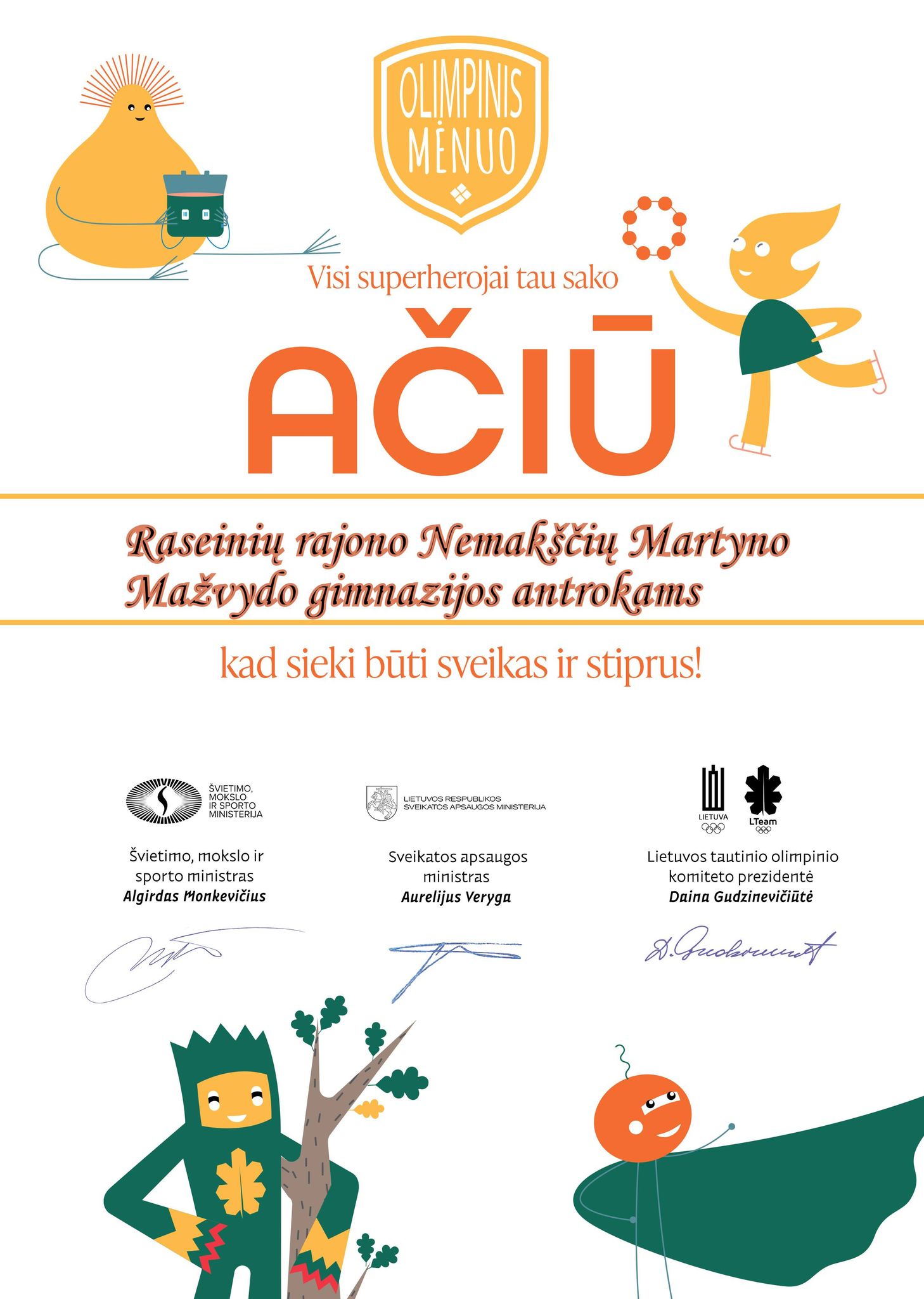 Rugsėjo 28 d. – spalio 23 d. 2 klasės mokiniai dalyvavo sveikatingumo projekte „Olimpinis mėnuo“, kurį organizavo Lietuvos Respublikos švietimo, mokslo ir sporto ministerija, Lietuvos Respublikos sveikatos apsaugos ministerija, Lietuvos tautinis olimpinis komitetas. Šis projektas skatino pradinių klasių moksleivius daugiau judėti, sveikiau maitintis, mokytis atpažinti savo emocijas, kokybiškai ilsėtis. Projektas vyko keturias savaites ir apėmė keturias temas – fizinį aktyvumą, sveiką mitybą, emocinę sveikatą ir kokybišką poilsį. Kadangi mokėmės nuotoliniu būdu, į visas užduotis žvelgėme kūrybiškai. Mokiniai kiekvieną rytą sportavo su Ąžuolu Galinguoju, dalyvavo įvairiose veiklose, priėmė iššūkius, kuriuos siūlė Amis Kilnaširdis, Una Superbičiulė, Luka Kibirkštis. Mokiniai stengėsi atsakingai vykdyti fizinio aktyvumo užduotis ir veiklas, priėmė siūlomus iššūkius.