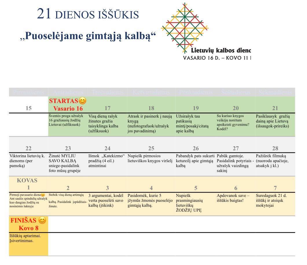Baigėsi Vasario 16-ąją startavęs mūsų gimnazijoje vienas iš Lietuvių kalbos dienoms skirtų renginių, kuriame buvo pakviesti dalyvauti 5 kl. mokiniai. „Puoselėjame gimtąją kalbą“ – taip vadinosi net 21 dienos iššūkis, raginęs penktokėlius susitelkti ir kūrybiškai prisidėti prie gražios iniciatyvos. Niekas nepaneigs, jog mokytojui yra prasminga ieškoti būdų ir formų stiprinant gimtosios kalbos mokymosi motyvaciją, o mokiniams – prisidėti prie jos prestižo didinimo.