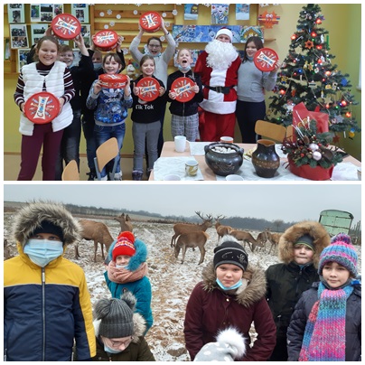 Taigi, gruodžio 11 dieną mokiniai, anksti ryte prikepę kūčiukų, išvirę kisielių, prisiminę kūčių papročius ir burtus, skubėjo į UAB „Arsira“ elnyną. O kaip įspūdingai atrodė atbėgančių į susitikimą tauriųjų elnių būrys! Gyvūnai buvo nusiteikę labai draugiškai, todėl drąsesni vaikai galėjo maitinti žvėrelius iš rankos. O Taškutė net nenorėjo atsisveikinti. Taip pat apsilankėme ir elninių šeimos žinduoliams priklausančių danielių ganykloje. Turėjome galimybę palyginti gyvūnų išvaizdą, elgseną, pakalbėjome, kaip galime padėti žvėreliams iškęsti žiemą. Į visus mums rūpimus klausimus atsakė bendrovės direktorius S. Dumskis. Pavyko išgirsti net žvėrelių kalbą. Įsitikinome, kad gamtininkas M. Čepulis buvo teisus, kalbėdamas apie jauniklių globą, nes elniai nė vieno mažylio mums neparodė. Juos tolėliau nuo žmonių saugojo „auklės“. Užtat dabar jau žinome, kokie elniai iš tikrųjų tempia Kalėdų senelio roges.