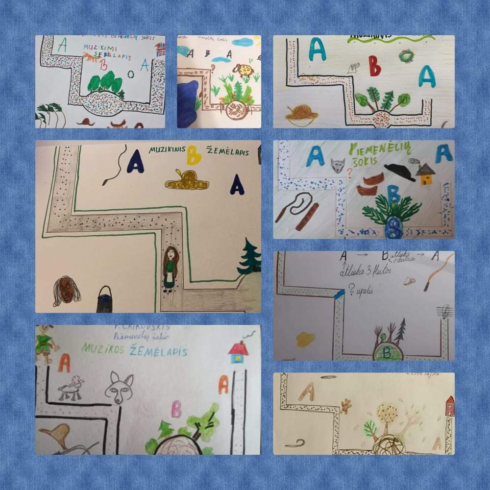 Baigiamasis mūsų pamokų ciklo akcentas mums buvo pats įdomiausias. Tai muzikinio mąstymo žemėlapio kūrimas. Remdamiesi įgyta patirtimi klausėmės P.Čaikovskio kūrinio „Piemenų šokis“, dalijomės mintimis su klasės draugais, kas turėtų atsispindėti šiame žemėlapyje, klausėme kūrinio ir sekėme instrumentų seką kūrinyje, kūrėme vaizdinius.