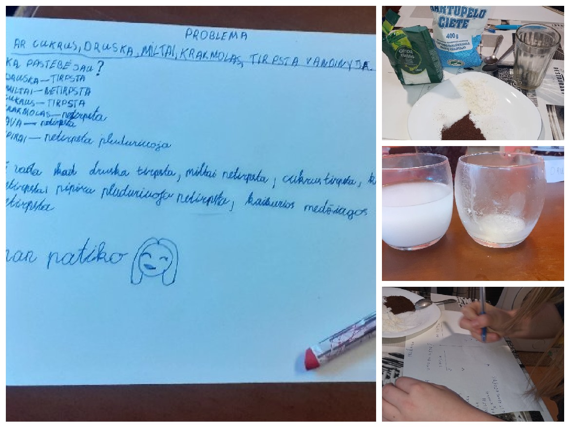 Sausio 7 dieną antrokai dalyvavo integruotoje pasaulio pažinimo ir matematikos pamokoje “Medžiagų tirpumas vandenyje”. Mokiniai mokėsi pasigaminti mišinį ir išsiaiškinti, kurios buityje esančios medžiagos yra tirpios, o kurios – netirpios. Tyrimui naudojome buityje esančias medžiagas – cukrų, druską, miltus, krakmolą, pipirus, kavą ir t.t.