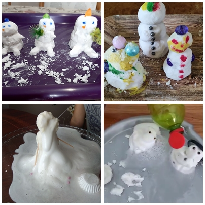 Pasirodo, sniego senius galima lipdyti ne tik lauke iš sniego! Ir būnant kambaryje juos galima pasidaryti. Tam reikia iš druskos, sodos ir skalbimo priemonių mišinio pasigaminti dirbtinį sniegą. O tada suteikiama laisvė lakiai vaikiškai vaizduotei ir mes turime dailių spalvingų „sniego senių“. Smagiausias momentas yra tada, kai tokį senį užpilame su acto tirpalu ir stebime įdomų jo tirpimo procesą, panašų į vulkano lavos tekėjimą. Išvada: veikiamas tirpiklio tirpsta ne tik sniegas, bet ir druska, skalbimo priemonės, soda.