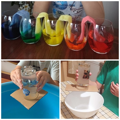 Bet daugiausiai įdomių tyrimų galima atlikti su skystąja vandens būsena. Tai ir vandens plėvelės tamprumas, spalvų difuzija, skirtingų tankių tirpalų osmosas ir ko tik dar nesugalvosi... Atlikdami šiuos bandymus mokiniai sužinojo, kad servetėlės medžiaga yra lengvai laidi vandeniui, o didesnio tankio tirpale lėčiau pasklinda dažinės medžiagos, tikrai pritaikys praktikoje išvadas, kad šiltame vandenyje cukrus greičiau tirpsta, nei šaltame. Bandymus pirmokėliai atliko padedami šeimos narių. Kartu jie praleido daug įdomių ir šiltų akimirkų. Dėkojame jiems!