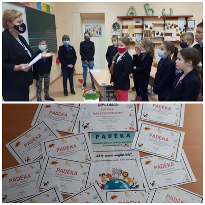 Lapkričio 17 d. trečiokus aplankė gimnazijos direktorė. Ji su mokiniais kalbėjo apie žmonijos ir gyvūnijos tamprų ryšį, pabrėžė gyvūnų svarbą žmonių gyvenime, suteikiant gyvenimui daugiau džiaugsmo ir prasmės, pasidžiaugė, kad mokiniai rūpinasi ir myli savo augintinius. Gimnazijos direktorė įteikė respublikinio nuotraukų konkurso "Mano augintinis” apdovanojimus. Austėja Navardauskaitė laimėjo pirmą vietą – apdovanota diplomu.